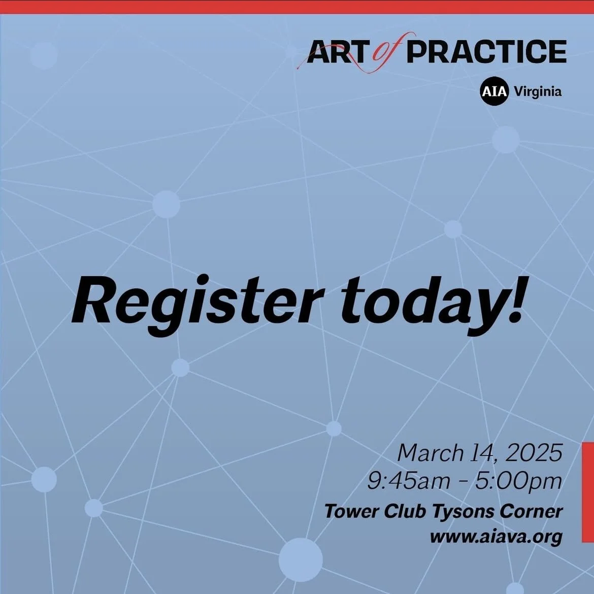 Seasoned and emerging leaders, from practices of all sizes, sole proprietors, allied organizations, educators, etc. from across the Commonwealth will converge on March 14, 2025, at the Tower Club Tysons Corner for the Art of Practice forum. The program is intended to cultivate strong leaders, identify solutions to common business challenges, advance business practices, and fuel collaboration across the profession.